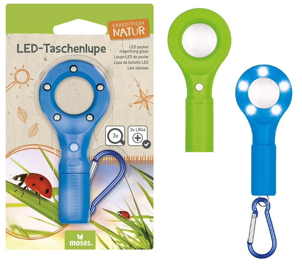 Fascynująca Kieszonkowa Lupa LED z kolekcji Expedition Natur. Daje małym odkrywcom wgląd w fascynujący świat przyrody Praktyczna, mała, z łatwością mieści się w kieszeni. Wyposażona w karabińczyk ułatwiający przypięcie do wszystkiego. Ma potrójne powiększenie. Drobne szczegóły ujawniają się w trybie oświetlenia z 5 diodami LED. W zestawie ogniwa guzikowe (3 x LR 44). Dostępna w dwóch kolorach, wysyłana losowo Wymiary: 10 x 4 x 1 cm. Nie świeć bezpośrednio w oczy! UWAGA!!! różne kolory, towar wysyłany losowo x