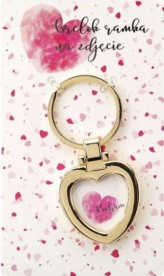 Metalowy brelok w kształcie złotego serca z miejscem na zdjęcie.