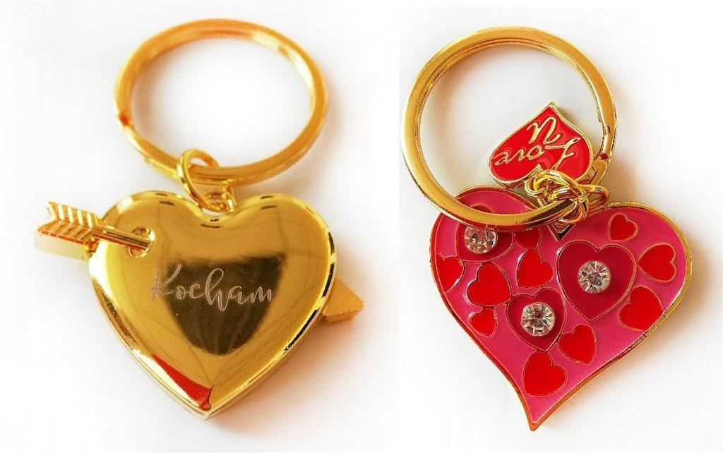 "Metalowy brelok w kształcie serca przebitego strzałą, ze specjalnym grawerem Kocham. Brelok w kolorze złota. Doskonale sprawdzi się jako upominek na walentynki, jak również na inne okazje.