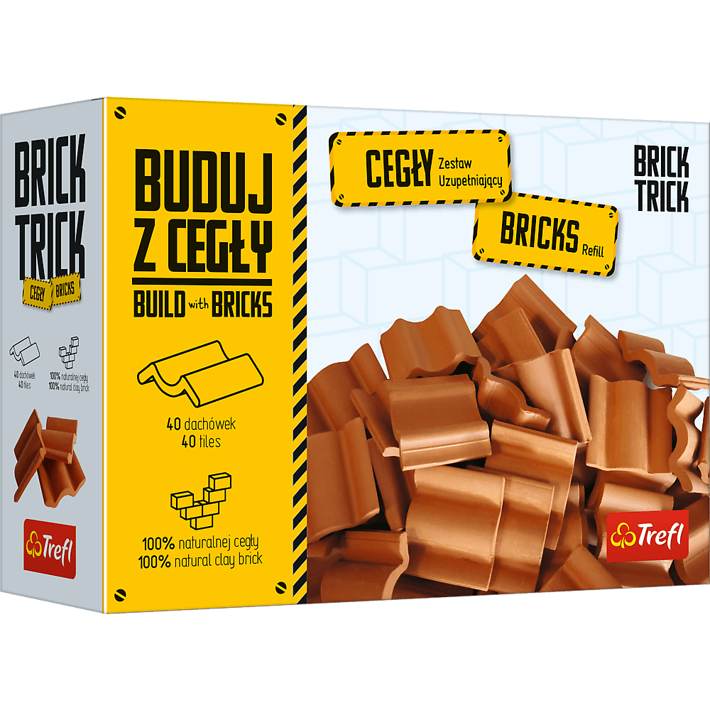 Zestawy uzupełniające Brick Trick to produkty z linii kreatywnych zabawek konstrukcyjnych marki Trefl, w której głównym budulcem jest prawdziwa, naturalna cegła. Chcesz kontynuować zabawę i tworzyć więcej projektów? Zestawy Brick Trick są dla Ciebie znakomitym rozwiązaniem. Każde opakowanie zawiera 40 prawdziwych cegieł. Użyj wyobraźni i nadaj budowli niepowtarzalny charakter dzięki własnym pomysłom. Całe cegły, połówki cegieł, a może dachówki? Sprawdź wszystkie zestawy uzupełniające i baw się dalej.