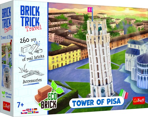 Krzywa Wieża w Pizie jest uważana za symbol Włoch dzięki eleganckiej strukturze z białego marmuru oraz swojemu wyjątkowemu nachyleniu. Produkt z serii Brick Trick Travel zabierze Cię do miasta we Włoszech, gdzie spróbujesz swoich sił w roli budowniczego. Do budowy wykorzystaj prawdziwe cegły i drewniane deseczki. Bogato zdobione elementy tekturowe możesz umieścić na ścianach budowli. Całość dopełnią dzwony oraz taras widokowy. Zbudowana wieża ma aż 39 cm wysokości, a cały zestaw zawiera co najmniej 92% naturalnych składników!
