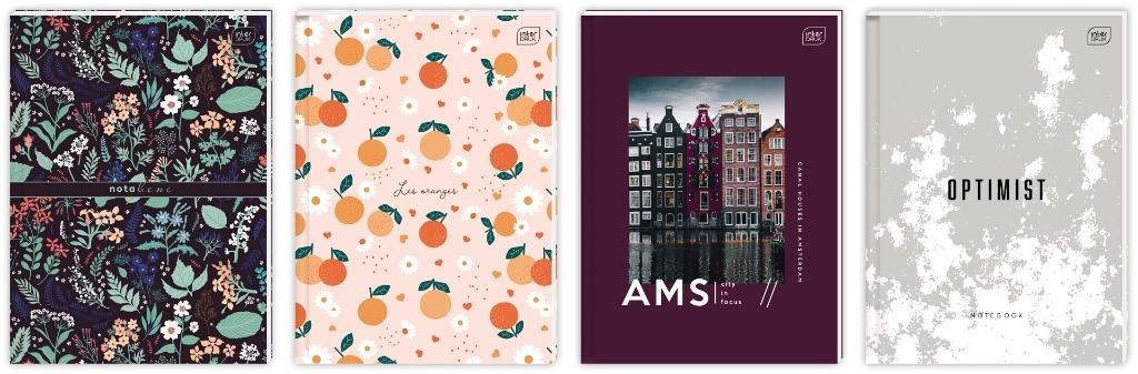 Brulion A4 gładki, 96 kartek, oprawa twarda, mix wzorów. 5 sztuk w opakowaniu zbiorczym. Producent Interdruk.