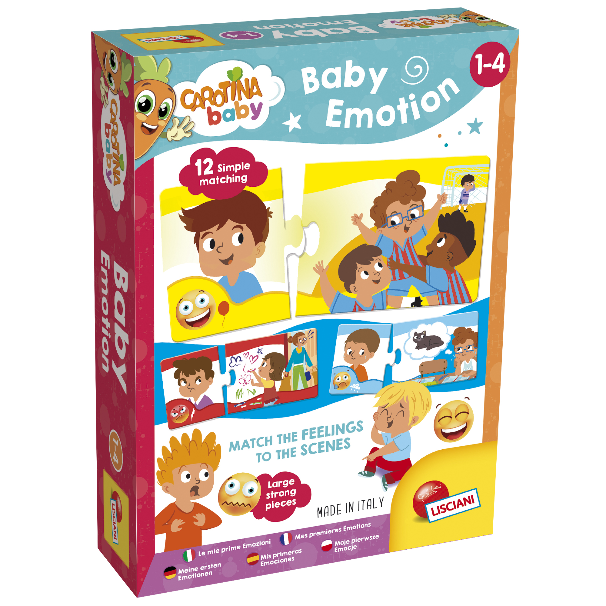 Zestaw edukacyjny włoskiego producenta Lisciani, dzięki któremu dzieci mogą poznać pierwsze emocje. Edukacyjna gra w opakowaniu polegająca na dopasowaniu konkretnej emocji do danej scenki pozwala dziecku na lepsze zrozumienie i wyrażanie swoich emocji.Opakowanie zawiera duże i wytrzymałe puzzle wysokiej jakości. Seria Carotina Baby pozwala dzieciom na zaspokojenie ich naturalnej ciekawości i poznanie otaczającego ich świata.