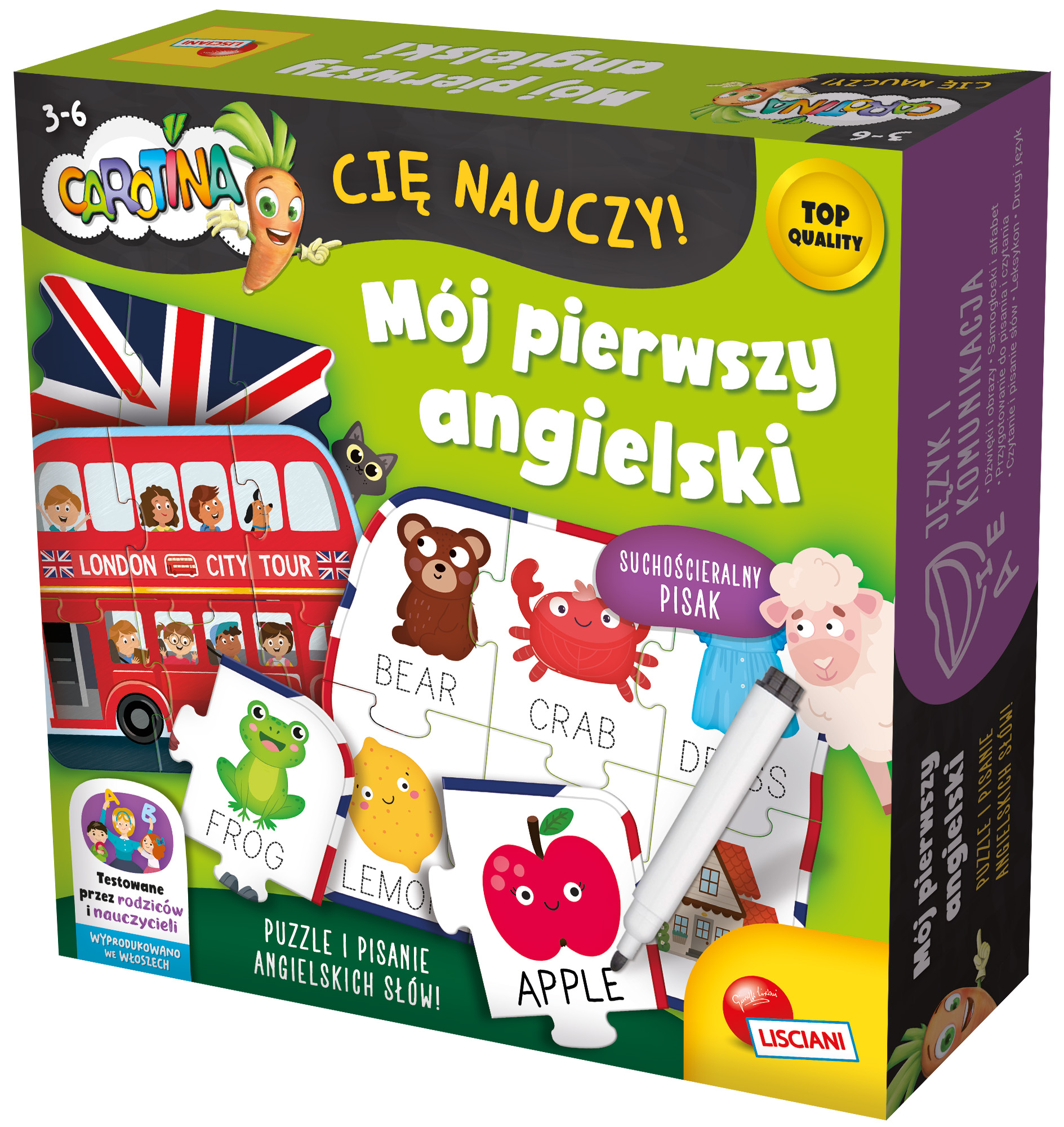 Opis produktuZasady bezpieczeństwaEdukacyjna gra, która w fascynujący sposób wprowadza dzieci w świat pierwszych angielskich słów! Zawiera mnóstwo kolorowych i angażujących układanek o ciekawych kształtach, które rozwijają kreatywność i logiczne myślenie. Na odwrocie znajdziesz powierzchnię do wielokrotnego pisania i zmazywania, dzięki innowacyjnemu pisakowi nauka nigdy nie była tak łatwa i przyjemna! x