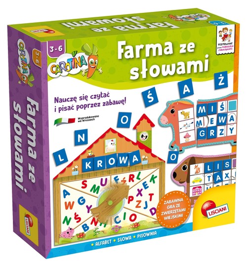 Oto gra, dzięki której dziecko nauczy się skutecznie czytać i pisać już od 3 roku życia! Po ułożeniu puzzli z 6 sympatycznymi zwierzętami z farmy, na ich tylnej części ułóż słowa za pomocą dołączonych do zestawu literek. Możesz bawić się sam lub grać z przyjaciółmi w zabawne bingo dzięki wspaniałemu kołu fortuny w kształcie młyna!