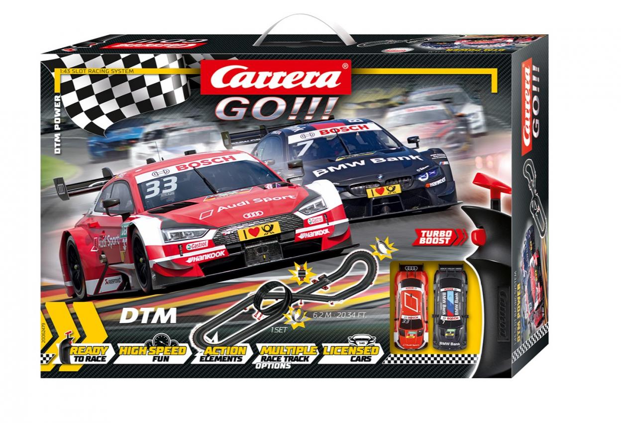 W zestawie znajduje się: -BMW M4 DTM ""B.Spengler, No.7"" 64131 - Audi RS 5 DTM ""R.Rast, No.33"" 64132 -1 Szyna przyłączeniowa -1 Transformator -2 Kontrolery - wiadukt - pochyły zakręt - pętla - licznik okrążeń -zapasowe wymienne szczotki stykowe i prowadnice - instrukcja PL Rozmiary po rozłożeniu: 234 x 68 cm Długość toru: 6.2 m Carrera GO!!! to system startowy do Świata Wyścigów Carrera, stworzony w skali 1:43. Wszystkie zestawy z tej serii zawierają kontroler turbo doładowania, a także oryginalne, licencjonowane samochody, wykonane z ogromną dbałością o szczegóły. Do każdego z nich dołączony jest zawsze dodatkowy zestaw szczotek stykowych. Systemy torów są niezwykle łatwe w montażu i demontażu, dzięki unikalnemu systemowi zatrzasków.