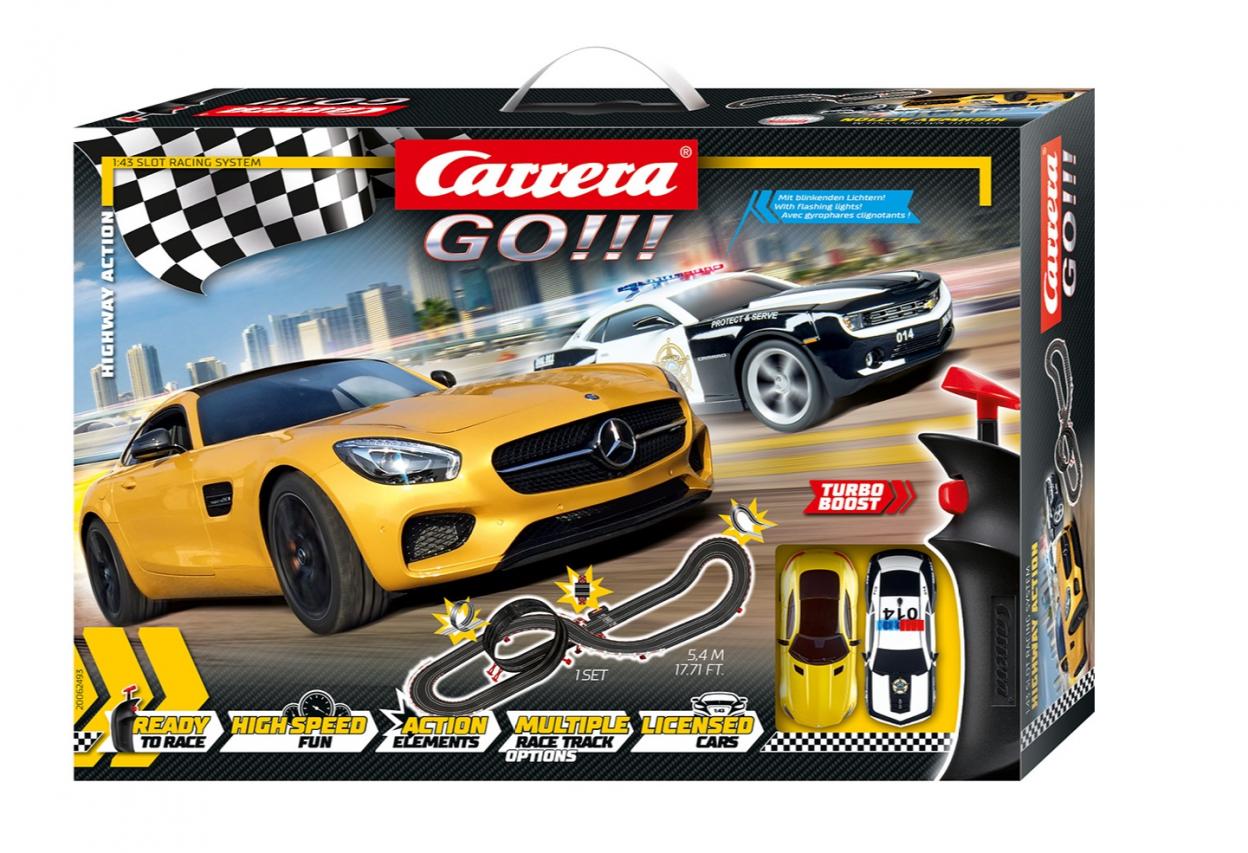 W zestawie znajduje się: - 2015 Chevrolet Camaro ZL1 ""Sheriff"" 64031 - Mercedes-AMG GT Coup solarbeam 64119 - 1 Szyna przyłączeniowa - 1 Transformator - 2 Kontrolery - wiadukt - pochyły zakręt - pętla - licznik okrążeń -zapasowe wymienne szczotki stykowe i prowadnice - instrukcja PL Rozmiary po rozłożeniu: 192 x 60 cm Długość toru: 5.4 m Carrera GO!!! to system startowy do Świata Wyścigów Carrera, stworzony w skali 1:43. Wszystkie zestawy z tej serii zawierają kontroler turbo doładowania, a także oryginalne, licencjonowane samochody, wykonane z ogromną dbałością o szczegóły. Do każdego z nich dołączony jest zawsze dodatkowy zestaw szczotek stykowych. Systemy torów są niezwykle łatwe w montażu i demontażu, dzięki unikalnemu systemowi zatrzasków.