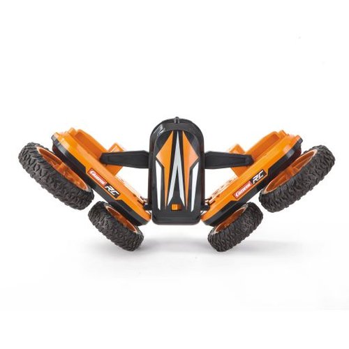 Carrera RC pojazd Supercross z kategorii tzw. "stunt cars" .Wykonany w technologii 2,4 GHz, gumowe opony, jazda 360° funkcja Super Spinning (rozchylające się koła na zewnątrz) i precyzyjne sterowanie 360°, światło LED, elastyczne nadwozie z wysokiej jakości tworzywa, auto-off po 30 min. do zabawy wewnątrz i na zewnątrz, ładowanie USB, akumulator 3.7V 500 mAh, skala 1:24, czas ładowania: ok. 60 min., czas zabawy: 15 min, prędkość: max. 6 km/h, długość auta: ok. 16 cm, w zestawie baterie do kontrolera 2 x AAA.
