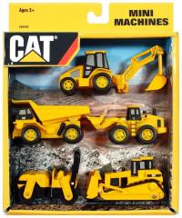 Zestaw pięciu mini pojazdów budowlanych CAT: wywrotka, ładowarka, koparka, spychacz, koparko-ładowarka.