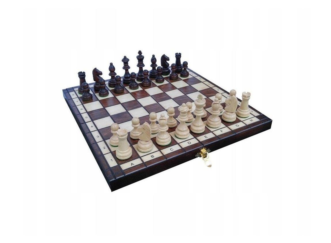 Opis produktuZasady bezpieczeństwaGra ""Szachy turniejowe"" zawiera ładną, drewnianą szachownicę z pionkami w drewnie. x