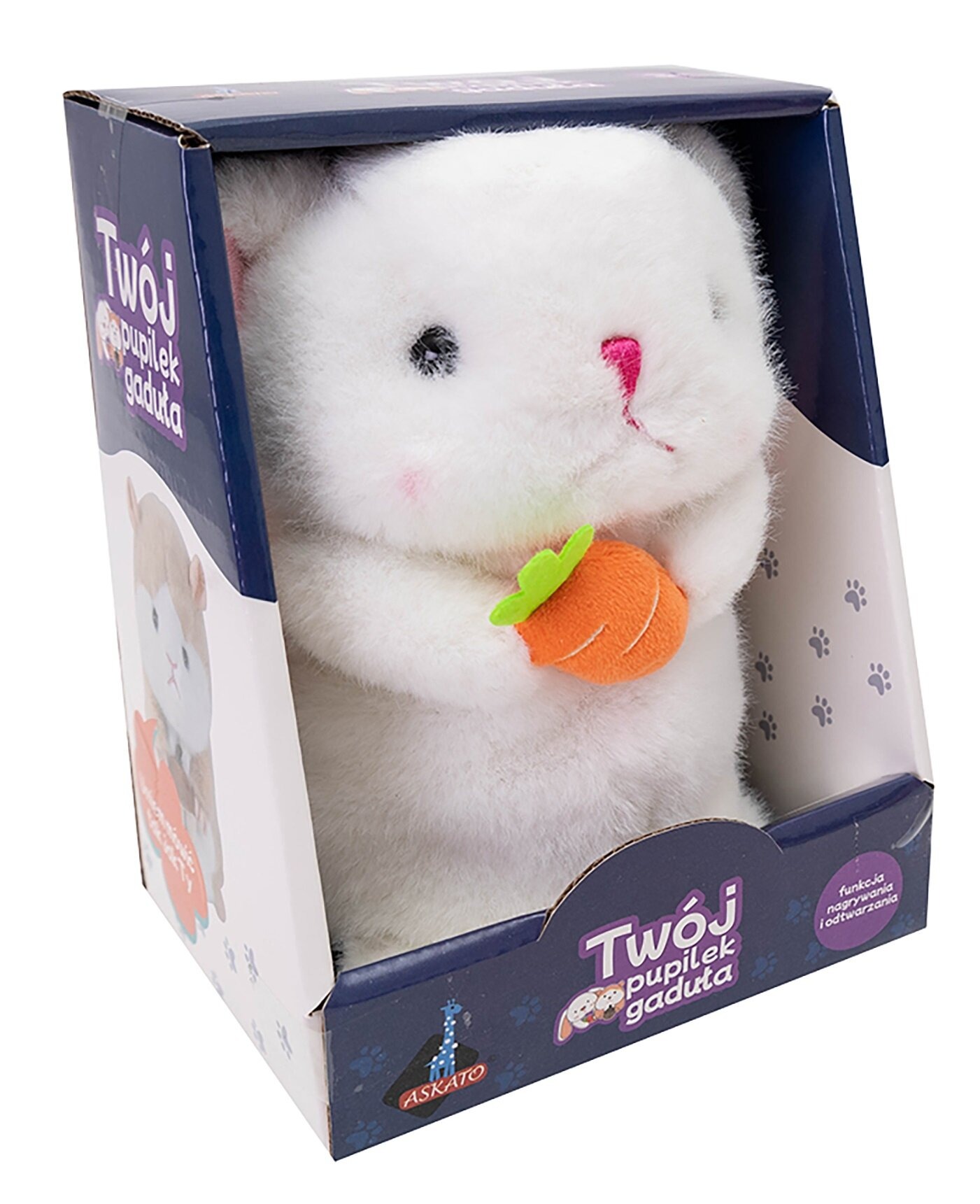 Opis produktuZasady bezpieczeństwaChomik powtarzający, ten niewielki pluszowy przyjaciel potrafi słuchać tego co do niego mówisz i powtarzać usłyszane słowa! Ta urocza pluszowa maskotka dzięki wbudowanemu mechanizmowi, dokładnie powtórzy to co do niego powiesz na swój zabawny chomiczy sposób. Włącz zabawkę przełącznikiem on/off umieszczonym obok na spodzie zabawki, ustaw chomika ok. 40 cm od siebie i wypowiedz wyraźnie, najlepiej bez przerw, krótki tekst,chomik powtórzy go w zabawny sposób zasilanie: 3xAAA (brak w zestawie) OPAKOWANIE W JĘZYKU POLSKIM Wiek 3+ x