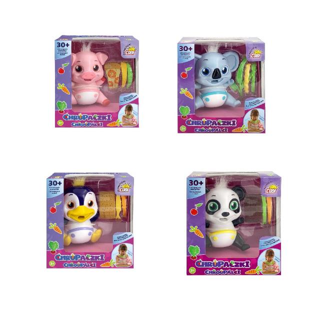 Opis produktuZasady bezpieczeństwaChrupaczki uwielbiają jeść, nakarm je i zobacz jak połykają jedzenie. Podczas jedzenia chrupiących przekąsek ruszają buzią. Wydają ponad 30 chrupiących dźwięków. Uwielbiają też dobra zabawę, zacznij do nich mówić lub klaskać w dłonie, a zareagują. Potrząśnij Chrupaczkiem, a zacznie chichotać. Mix wzorów, towar wysyłany losowo. x