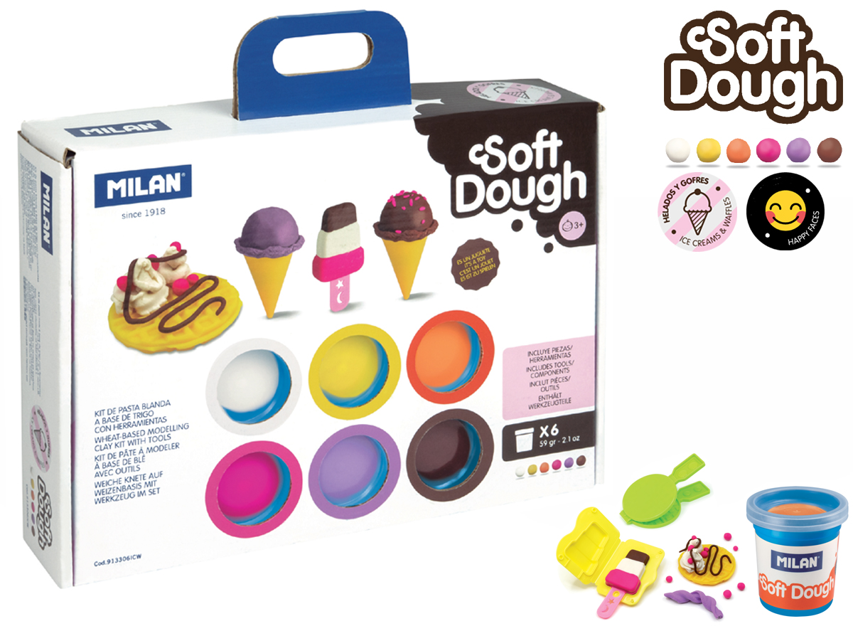 Zestaw do modelowania ciasta na bazie mąki pszennej "Ice Creams". Zawartość walizki: 6 puszek po 59 g (biały, żółty, pomarańczowy, różowy, liliowy i brązowy) oraz 10 elementów/narzędzi. Miękkie ciasto jest spójne i elastyczne, łatwe do formowania. Nowe kolory można tworzyć łącząc dwa lub więcej kolorów. Nie pozostawia śladów na dłoniach. Składniki pochodzenia roślinnego (zawiera gluten). x