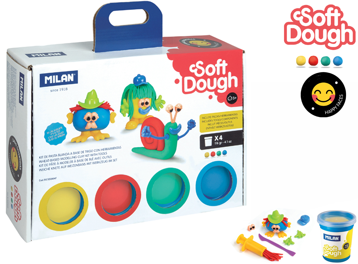 Zestaw do modelowania na bazie pszenicy "Śmieszne twarze". Zawartość walizki: 4 puszki po 116 g (kolory żółty, czerwony, zielony i niebieski), 27 sztuk i 2 narzędzia. Miękkie ciasto jest spójne i elastyczne, łatwe do formowania. Nowe kolory można tworzyć łącząc dwa lub więcej kolorów. Nie pozostawia śladów na dłoniach. Składniki pochodzenia roślinnego (zawiera gluten). x