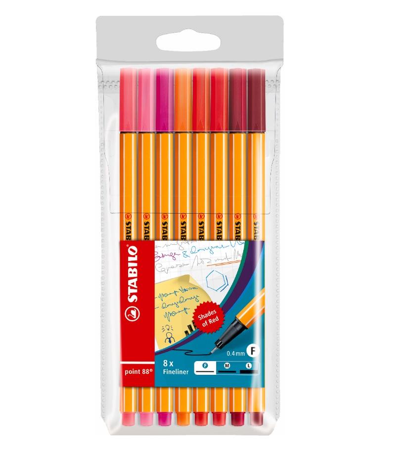 Uniwersalny cienkopis do pisania, podkreślania, kreślenia i kolorowania. Mocna, oprawiona w metal końcówka jest odporna na złamania i rozwarstwienia, co gwarantuje wysoki komfort pisania aż do całkowitego wyczerpania tuszu. Grubość linii 0,4 mm. Wentylowana skuwka umożliwia oddychanie w przypadku nagłego połknięcia. Jedyny cienkopis dostępny aż w 47 kolorach. Plastikowe etui z zawieszką zawierające 8 szt. w odcieniach koloru czerwonego x
