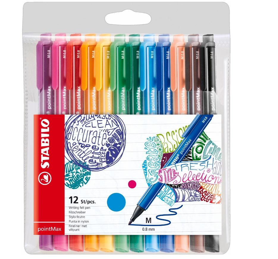 CIENKOPIS STABILO POINTMAX. Innowacyjne, intensywnie kolorowe cienkopisy dla najbardziej kreatywnych. Doskonały komfort pisania - nawet podczas intensywnego użytkowania. Specjalnie opracowana, wytrzymała nylonowa końcówka. Tusz na bazie wody, bezwonny. Szerokość linii 0,8 mm. Pozostawiony bez skuwki nie zasycha przez 24h. Dostępny w 12 kolorach. Plastikowe etui z zawieszką zawiera 12 szt cienkopisów we wszystkich kolorach.