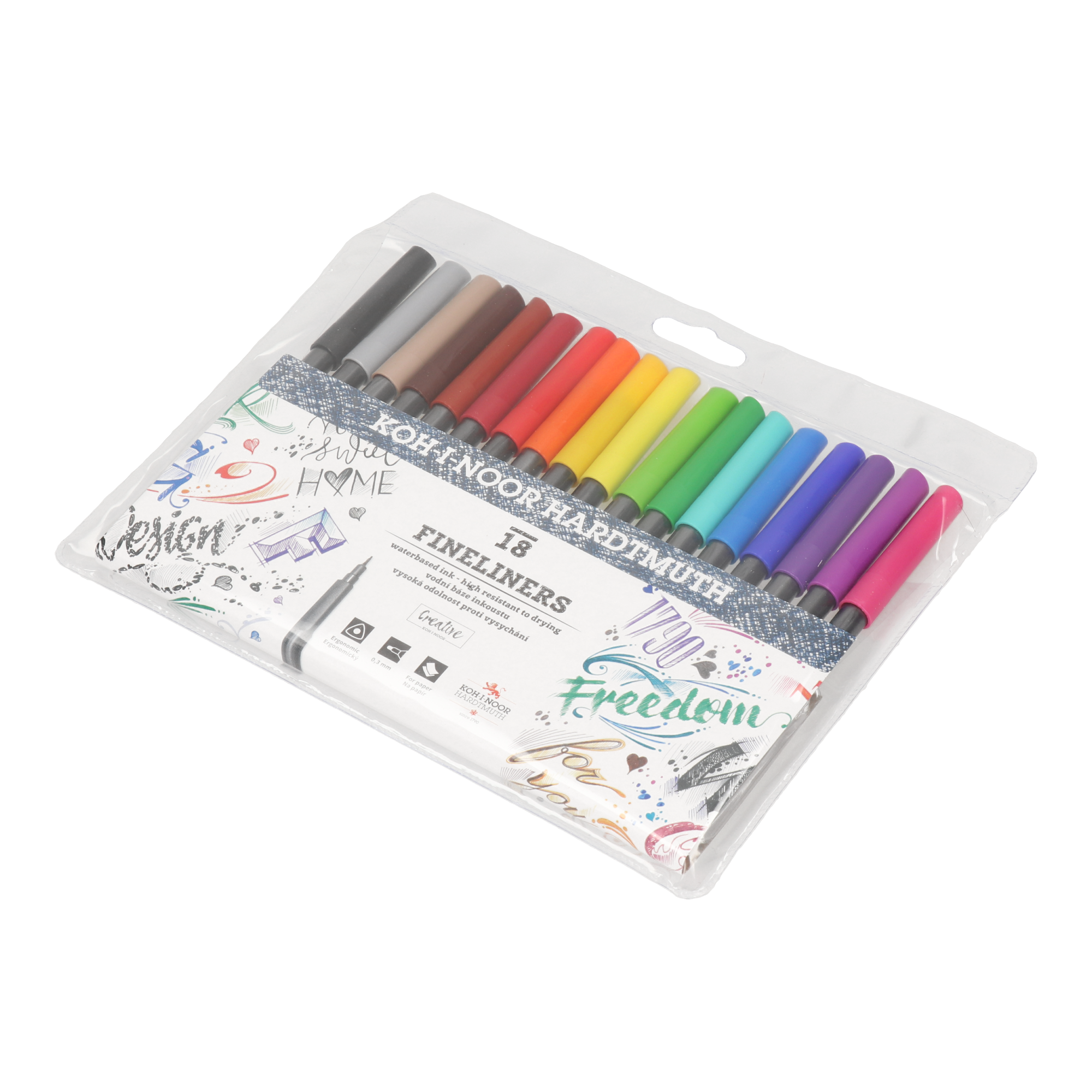 Cienkopisy przeznaczone głównie do pisania, szkicowania i rysowania na papierze. Zestaw 18 kolorów. Ze względu na ergonomiczny, trójboczny kształt są wygodne w użytkowaniu. Zawierają tusz na bazie wody, są spieralne z większości tkanin. Posiadają końcówkę o grubości 0,3mm, która dzięki specjalnej technologii tuszu nie zasycha przez dłuższy czas bez skuwki. Świetnie sprawdza się przy wymagających precyzji zadaniach, jako narzędzie do ozdabiania tekstu oraz robienia notatek. Zostały wyprodukowane zgodnie z europejskimi normami bezpieczeństwa na terenie Unii Europejskiej.