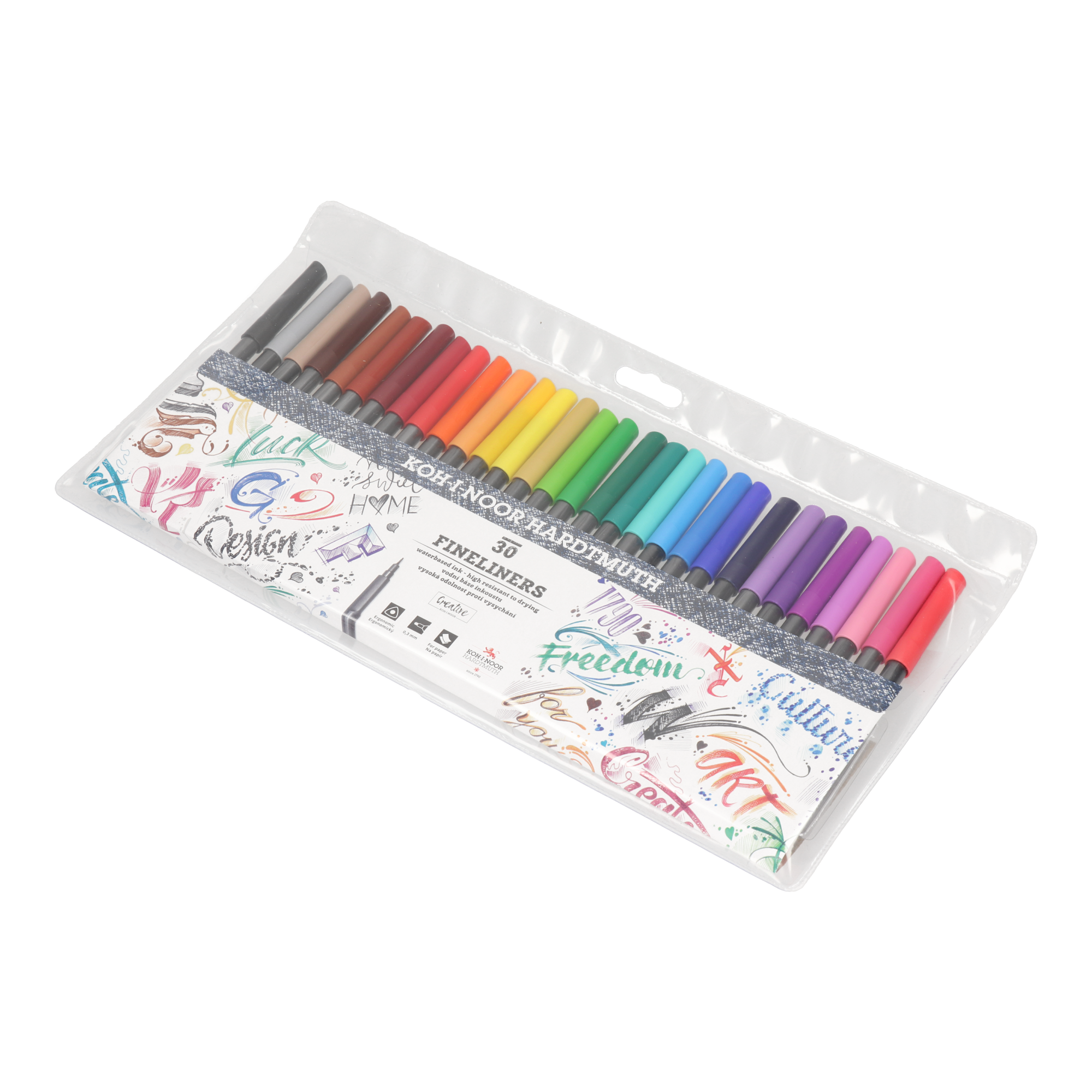 Cienkopisy przeznaczone głównie do pisania, szkicowania i rysowania na papierze. Zestaw 30 kolorów. Ze względu na ergonomiczny, trójboczny kształt są wygodne w użytkowaniu. Zawierają tusz na bazie wody, są spieralne z większości tkanin. Posiadają końcówkę o grubości 0,3mm, która dzięki specjalnej technologii tuszu nie zasycha przez dłuższy czas bez skuwki. Świetnie sprawdza się przy wymagających precyzji zadaniach, jako narzędzie do ozdabiania tekstu oraz robienia notatek. Zostały wyprodukowane zgodnie z europejskimi normami bezpieczeństwa na terenie Unii Europejskiej.