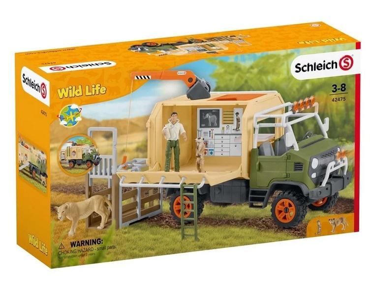 Strażnik Tom i jego przyjaciel surykatka Ted wyruszają ciężarówką ratunkową dla zwierząt z serii Schleich(R) Wild Life do pierwszej wspólnej akcji ratunkowej. Podczas safari Tom i Ted znajdują lwicę, której muszą udzielić natychmiastowej pomocy w ciężarówce. W tym celu spuszczają kabinę ratunkową na ziemię. Teraz mogą pomóc lwicy. Ich auto jest bowiem świetnie wyposażone, a strażnik Tom zawsze ma przy sobie apteczkę i stetoskop. Po opatrzeniu lwica umieszczona zostaje w skrzyni transportowej. Najpierw za pomocą dźwigu kabina wciągana jest na ciężarówkę, a potem skrzynia może zostać umocowana na samochodzie. Przy dużym wodopoju Tom i Ted wypuszczają lwicę ze skrzyni. Tu będzie mogła sobie odpocząć. Wciągarkę do dźwigu można przymocować przy kabinie kierowcy. x