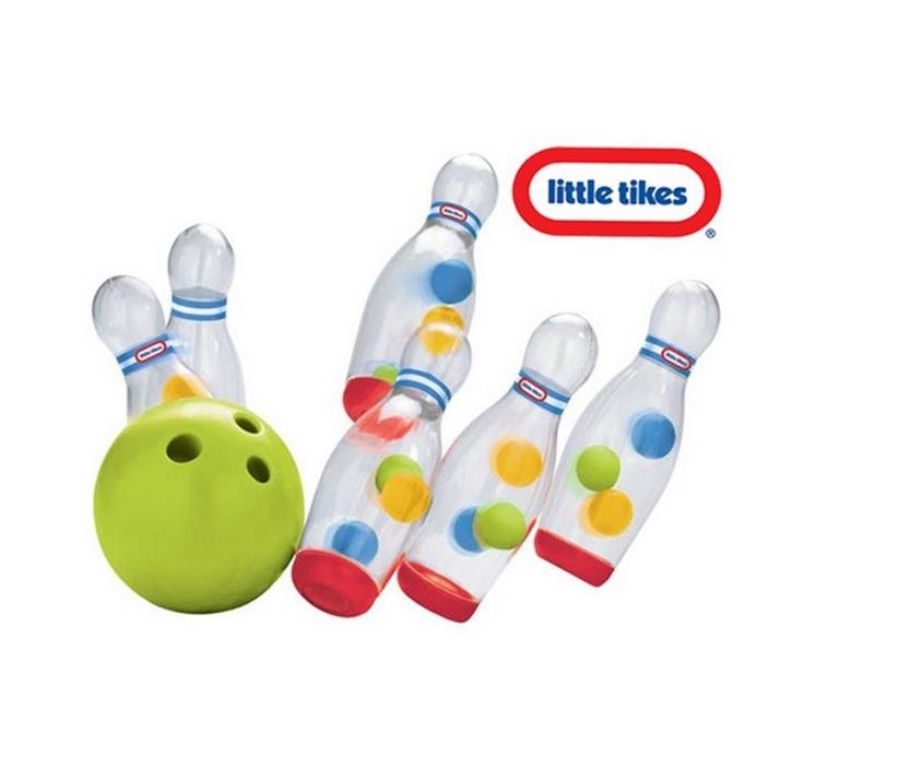 Zestaw do gry w kręgle składający się z 6 kręgli i kuli. Przezroczyste kręgle są wypełnione kolorowymi piłeczkami.