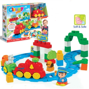 Przepiękny pociąg, który sam się porusza dzięki elektrycznemu silniczkowi.Bogaty zestaw, który zawiera 35 różnych części takich jak: lokomotywa, wagony, tory, mostek, wiadukt, semafory i wiele innych.Stymuluje umiejętności manualne i uczy zależności przyczynowo-skutkowych.Doskonale działa na zmysły: żywe kolory pobudzają percepcję wzrokową, uwagę i zdolność obserwacji oraz umiejętność kategoryzacji.Wydaje rzeczywiste dźwięki pociągu.Klocki miekkie i bezpieczne.Wykonane z nadającego się do mycia, nietoksycznego i pachnącego materiału.