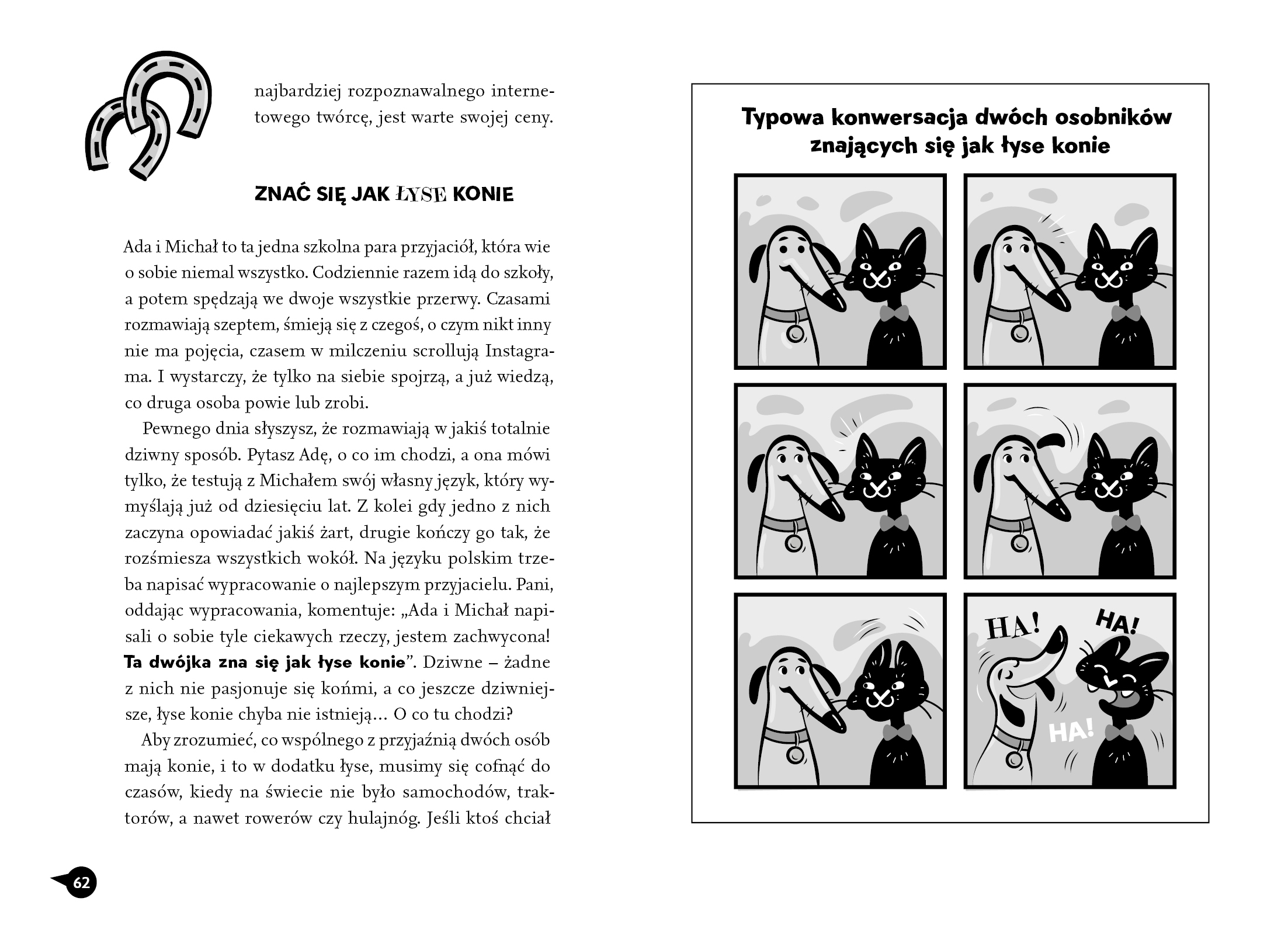 Opis produktuZasady bezpieczeństwaO co chodzi twojemu znajomemu, gdy mówi, że znacie się jak łyse konie, mimo że macie włosy? Dlaczego podczas kłótni rodzice twierdzą, że stajesz okoniem, a ty przecież leżysz na kanapie i scrollujesz telefon? I czemu wszyscy chcą zbijać kokosy, skoro arbuzy są sto razy lepsze? Nie masz zielonego pojęcia. Ale w sumie to czemu nie żółtego albo czerwonego?! Razem z FireVerką ogarnij wszystkie najdziwniejsze powiedzenia i zwroty z księżyca. Odkryj tajemnice kociej mordy, niebieskich migdałów i puszczania bąków. Językowe rozkminy czas zacząć! "Arcyciekawa książka! Weronika Zych nie tylko opowiada, skąd się wzięły powiedzenia, którymi się dziś posługujemy, ale i zachęca do zabawy językiem. Kto wie, może jakieś nasze powiedzonko stanie się kiedyś powszechnym powiedzeniem?" - Michał Rusinek "Ile razy ktoś ci powiedział: "Nie masz o tym zielonego pojęcia" albo "Przestań myśleć o niebieskich migdałach"? To nie są zwykłe zwroty, każdy z nich ma swoją historię! Czasem jest ona zaskakująca, innym razem zabawna albo po prostu dziwna. Otwórz głowę i ruszaj tropem najbardziej zaskakujących tajemnic języka!" - Dawid Łasiński, Pan Belfer Weronika Zych, znana jako FireVerka, dzieli się w mediach społecznościowych swoją miłością do polszczyzny. Z wykształcenia filolożka, z pasji - odkrywczyni ciekawostek językowych i niezwykłych słów. Pokazuje język od innej strony - nie jako zbiór zasad do zakuwania po nocach, ale jako przygodę, która dzieje się tu i teraz, w rozmowach, żartach i memach. Recenzje:✖ Opinia niepotwierdzona zakupem