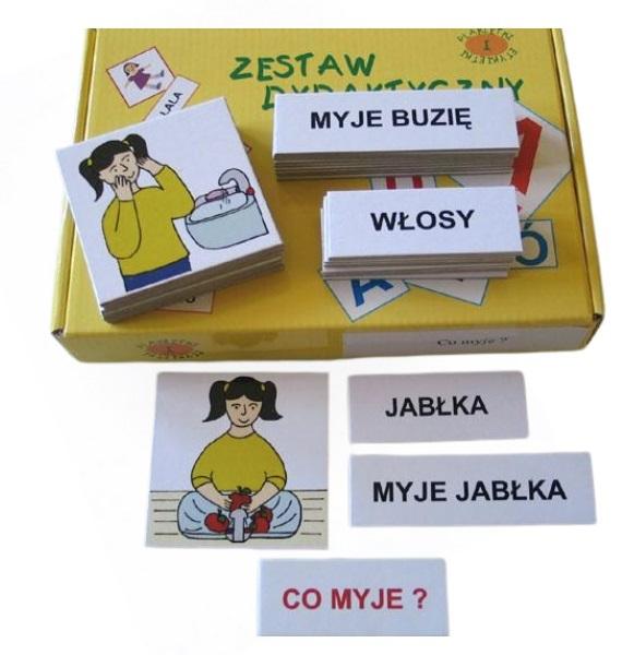 Zestaw plakietek i etykietek służy do przenoszenia obrazów z rzeczywistości na obrazki, uświadamianiu dziecku, że słowo (napis) oznacza konkretną rzecz, czynność czy sytuację oraz do nauki czytania. Uczy dziecko rozumienia pytań oraz udzielania odpowiedzi.Zestaw ten słuzy do nauki odnajdywania na obrazku sytuacji przedstawionych w rzeczywistości, imitowania czynności mycia określonych części ciała lub przedmiotów na podstawie obrazka - rozumienie pytania: Co myje?, oraz udzielania odpowiedzi obrazkiem, etykietką lub słowem, do nauki czytania globalnego (całymi wyrazami), zapamiętywania zdania dwuwyrazowego. - 10 elementów obrazkowych