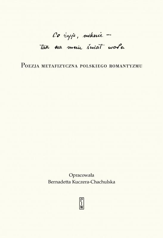 Opis produktuZasady bezpieczeństwaCo żyje niknie, tak na mnie świat woła Bernadetty Kuczery-Chachulskiej to autorski wybór wierszy czterech najważniejszych poetów polskiego romantyzmu: Adama Mickiewicza, Juliusza Słowackiego, Zygmunta Krasińskiego i Cypriana Norwida. Tom został uzupełniony o oryginalne studium interpretacyjne. Według badaczki metafizyczna myśl w sztuce słowa polskiego romantyzmu stała się możliwa dzięki formalnej rewolucji języka poetyckiego, która dokonała się w XIX wieku. Dynamika zmian społecznych oraz rozwój nowych sposobów artystycznego wyrażania nałożyły się na siebie, tworząc szczególny splot. Książka Kuczery-Chachulskiej stanowi wyjątkową próbę odczytania metafizycznego wymiaru poezji romantycznej. x