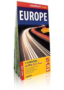 Dwustronnie laminowana, wygodna w składaniu mapa samochodowa Europy, stan dróg 2011, autostrady w budowie, 5 kategorii dróg, numeracja dróg międzynarodowych, odległości drogowe w kilometrach, promy samochodowe, indeks ponad 10 000 miejscowości.