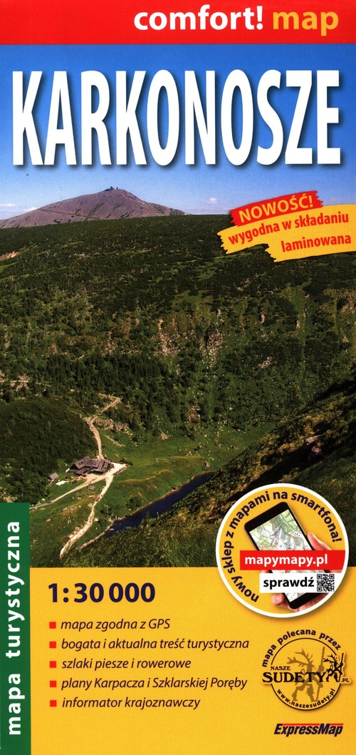 laminowana mapa turystycznaNajwyższe pasmo górskie Sudetów to gratka dla wspinaczy, odnajdą się tu także trekkingowcy, rowerzyści i narciarze. Nasza dwustronnie laminowana mapa, opracowana we współpracy z doświadczonymi krajoznawcami z regionu, pomoże zaplanować udane wakacje w Karkonoszach. Obejmuje obszar od Przełęczy Szklarskiej na zachodzie po Przełęcz Okraj na wschodzie. Dodatkowo zawiera plany Karpacza i Szklarskiej Poręby w szczegółowej skali 1:15 000 (1 cm -150 m) oraz mapę szlaków turystycznych w Karkonoszach.