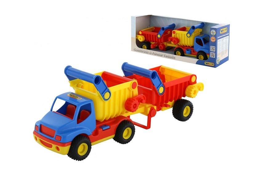 Samochód-wywrotka z naczepą ConsTruck z rączką do przenoszenia.