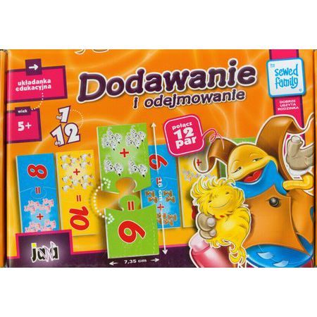 Układanki edukacyjna przeznaczona dla dzieci w wieku przedszkolnym, pomocna w nauce liczenia, dodawania i odejmowania.