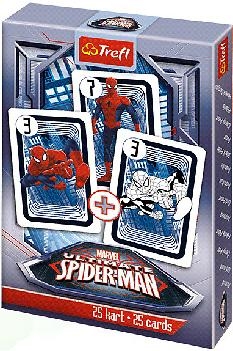 Spider-Man - gra Piotruś""Piotruś to gra, którą znają wszystkie polskie dzieci. Proste zasady i szybka, emocjonująca rozgrywka to przyczyny jej sukcesu i popularności. Jeśli dodać do tego karty z wizerunkami najbardziej popularnych postaci z bajek, kreskówek, komiksów i filmów otrzymujemy produkt, który kochają wszystkie dzieci.W grze bierze udział od 2 do 4-5 graczy, którzy mają za zadanie dobrać karty w pary i jak najszybciej pozbyć się swojego wachlarza. Gracze sami wybierają wariant gry - czy rozdają wszystkie karty i losują je od sąsiada, czy przeznaczają do losowania część talii. W talii znajduje się ""Piotruś"", czyli karta bez pary. Ten, kto zostanie z nią na koniec gry, przegrywa rozgrywkę.Gra zapewnia dużą dawkę śmiechu i ćwiczy spostrzegawczość. Talia ze Spider-Manem - superbohaterem z uniwersum Marvela.Talia zawiera 25 listków karcianych