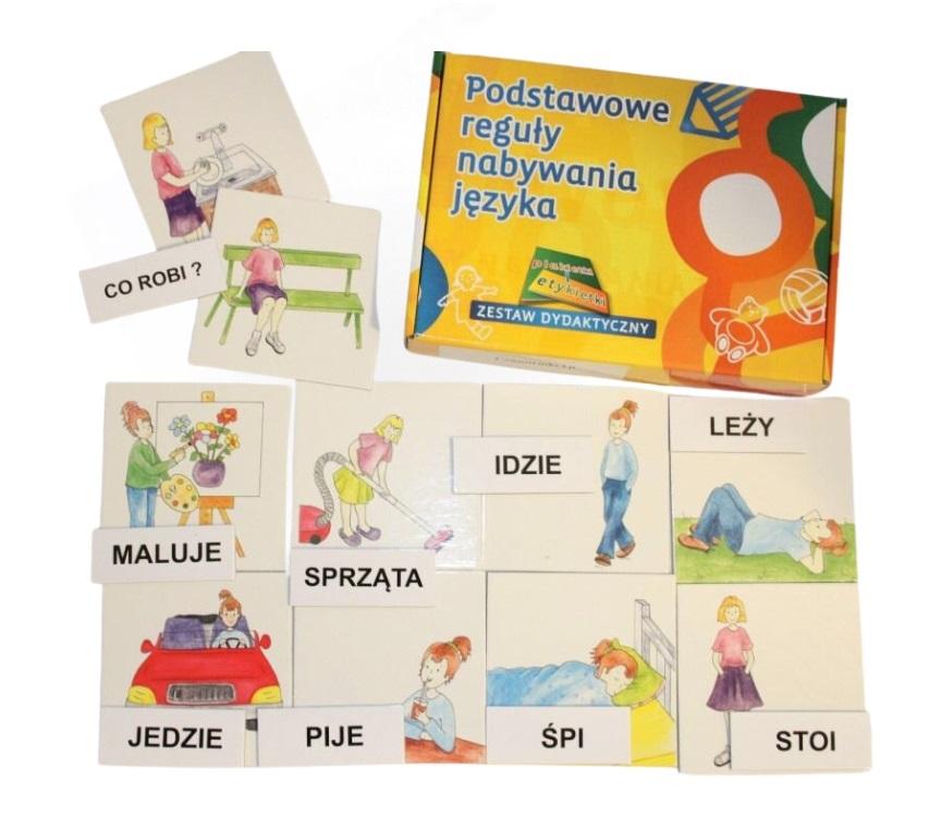 Zestaw zawiera: - 18 elementów obrazkowych (18 czynności) - 19 etykietek opisowych - opis przykładowych ćwiczeń