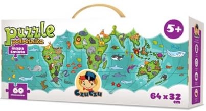 Puzzle Mapa świata Zwierzęta to zaproszenie do podróży przez kontynenty, na których możemy spotkać ulubionego przez dzieci słonia czy niedźwiedzia, ale również zadziwiającego latającego lisa czy warana. Fascynujące osobistości zamieszkują też morza i oceany! Wszyscy znamy przyjazne delfiny, ale czy wiecie jak wygląda czarny diabeł morski lub żeglarek argo?Edukacyjna układanka CzuCzu liczy 60 elementów. Wymiar puzzli po ułożeniu to 64x32 cm.