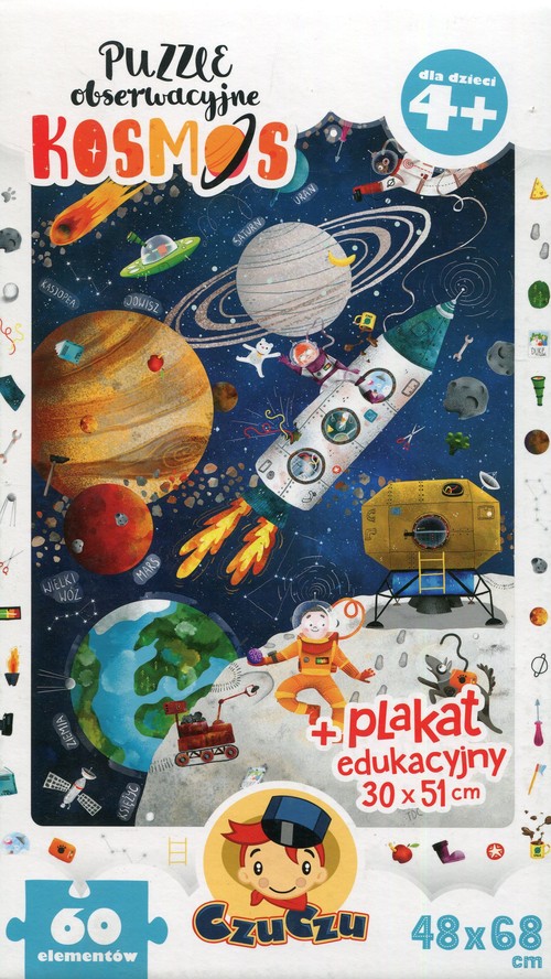 Opis produktuZasady bezpieczeństwaKosmiczna przygoda może zacząć się na podłodze w dziecięcym pokoju Odpalajcie rakiety! Zobaczcie, jak fascynujący jest Układ Słoneczny i odkryjcie niektóre jego tajemnice. Kolorowe, pełne zabawnych szczegółów puzzle zachęcą dzieci do zdobywania nowej wiedzy i pogłębiania zainteresowań. Do puzzli dołączyliśmy plakat pełen kosmicznych ciekawostek. Edukacyjny zestaw to doskonały pomysł na prezent dla ciekawego (wszech)świata przedszkolaka i fantastyczna inspiracja do wspólnej zabawy. Wyjątkowa cecha: zabawa nie kończy się na ułożeniu puzzli! Szukajcie detali na ilustracji i pozwólcie, by ciekawostki z plakatu zainspirowały was do własnych odkryć. Bawcie się i doskonalcie różne umiejętności. Obserwacyjne puzzle Kosmos to zaproszenie do gwiazd i pomysł na piękny prezent dla ciekawych (wszech)świata odkrywców! Dziecko w wieku przedszkolnym ma wszechstronne zainteresowania i zadaje mnóstwo pytań. Dlatego wybierzcie mądre, inspirujące zabawki. Zabawa z puzzlami zachęca do zdobywania i pogłębiania wiedzy na temat kosmosu, inżynierii i technologii. Tym razem to pierwszy krok w kierunku kosmicznych odkryć.