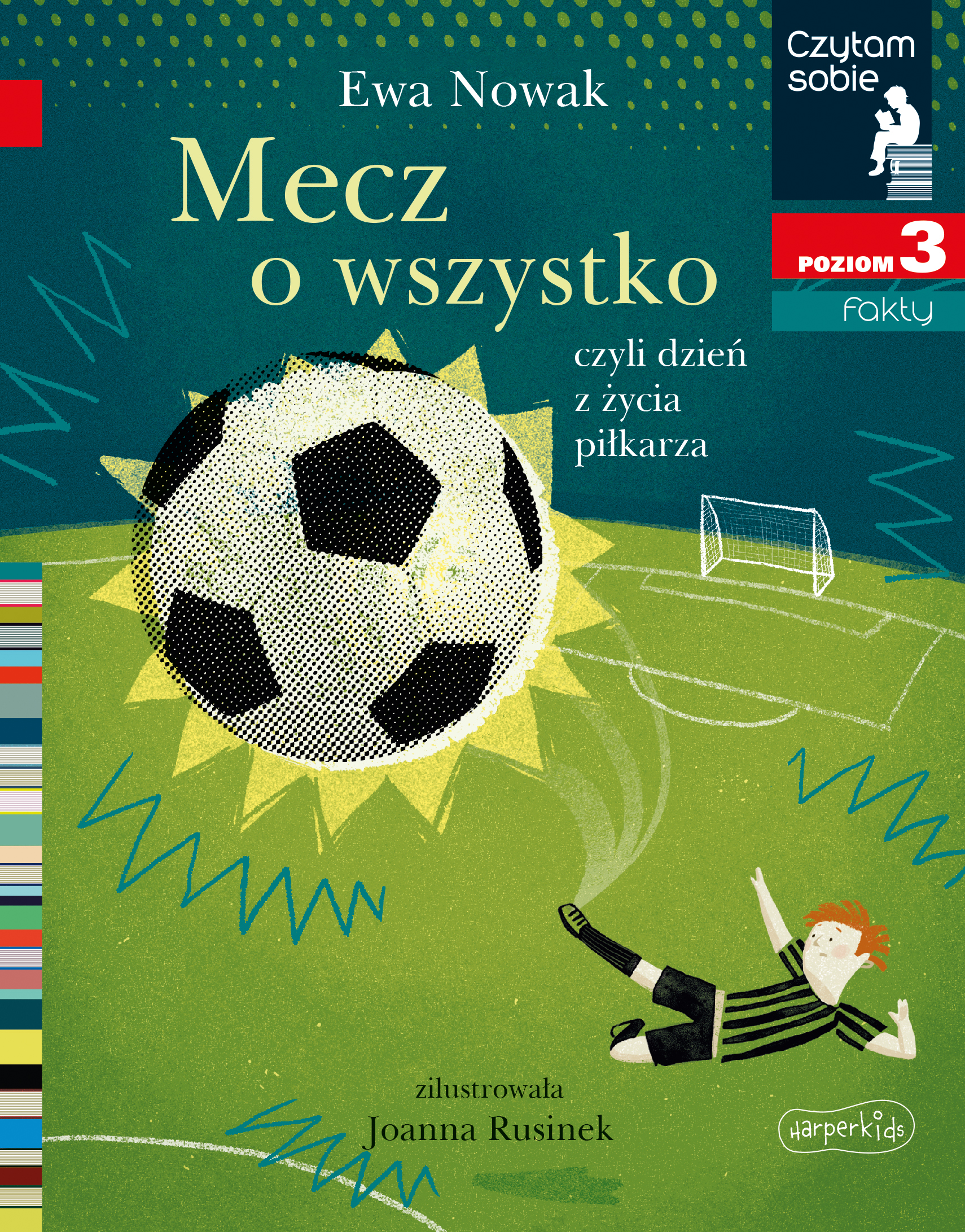 Mecz o wszystko. Czytam sobie (poziom 3.) to prawdziwa gratka dla fanów piłki nożnej, którzy potrafią już sprawnie czytać. Czy łatwo jest być piłkarzem? A może profesjonalny sport wiąże się z czymś więcej, niż tylko dobrą zabawą? Z tej książki dowiecie się więcej o codziennym życiu sportowców, poznacie także zasady fair play oraz rolę ciężkiej, systematycznej pracy nad sobą. Tę pouczającą opowieść stworzyła Ewa Nowak, popularna autorka książek dla dzieci i młodzieży, a czarno-białe ilustracje przygotowała Joanna Rusinek, wybitna rysowniczka.