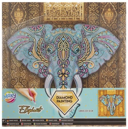 Mozaika diamentowa polegająca na przyklejaniu diamencików za pomocą specjalnego pisaka. W zestawie znajduje się szablon z opisem, które kolory odpowiadają przypisanym numerkom. Motyw głowy słonia, to obrazek na ramce o wymiarze 30 x 30 cm. Zestaw zawiera: