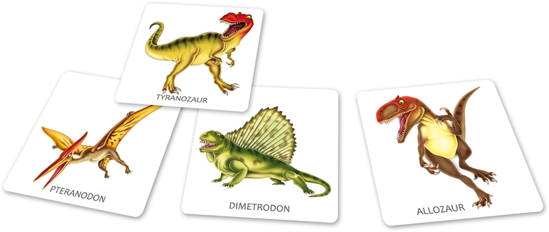 Zestaw zawiera 48 kartoników pogrupowanych w pary. Na obrazkach znajdują się 24 dinozaury i inne prehistoryczne potwory, wśród nich: tyranozaur, triceratops, diplodok a także smilodon.