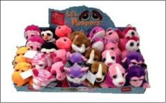 Display pluszowych maskotek. W zestawie 14 rodzajów maskotek po 2 sztuki, razem 28 sztuk. Przeciętna wysokość maskotek ok.15cm.