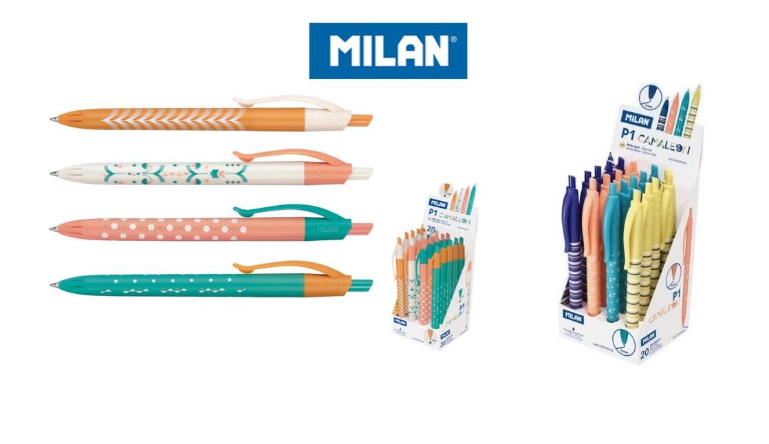 Długopisy niebieskie P1 CAMELEON z kolorową obudową z nadrukami. Pstrykane. Przybliżona długość pisania: 1200 metrów. Końcówka 1 mm. Atrament wyprodukowany w Niemczech. Oryginalny produkt stworzony przez własny dział badawczo-rozwojowy MILAN. Rozmiar długopisu: 14,1 x 1,7 Ø 1 cm.