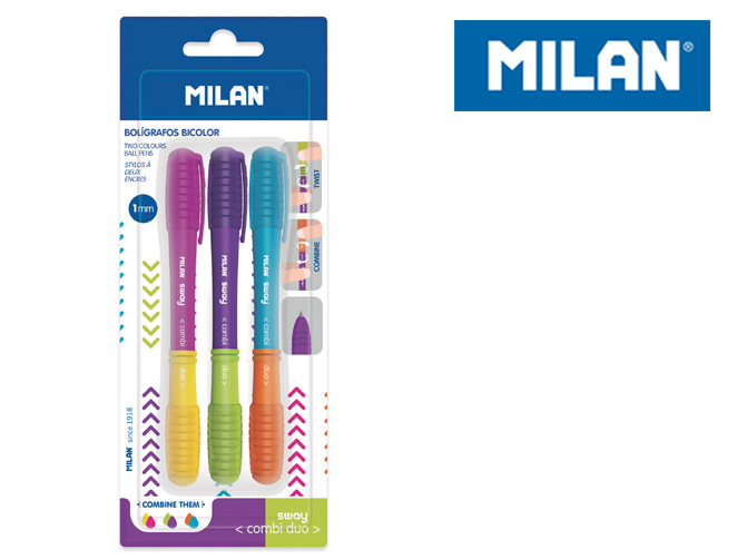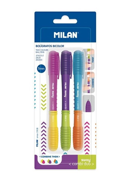 3 długopisy SWAY COMBI DUO: fioletowo - jasno zielony, różowo - żółty, jasno niebieski - pomarańczowy. Kolor obudowy odpowiada kolorowi tuszu. Długopisy z dwiema wymiennymi końcówkami, łatwe do złożenia i ponownego rozdzielenia dzięki systemowi obrotu. Długopisy COMBI DUO oferują łącznie 10 kolorów tuszu, pełny zakres pozwala na 25 różnych kombinacji. Przybliżona długość pisania: 650 metrów. Końcówka 1 mm. Oryginalny produkt stworzony przez własny dział badawczo-rozwojowy MILAN. Rozmiar długopisu: 13,7 x 1,7 Ø 1,2 cm.
