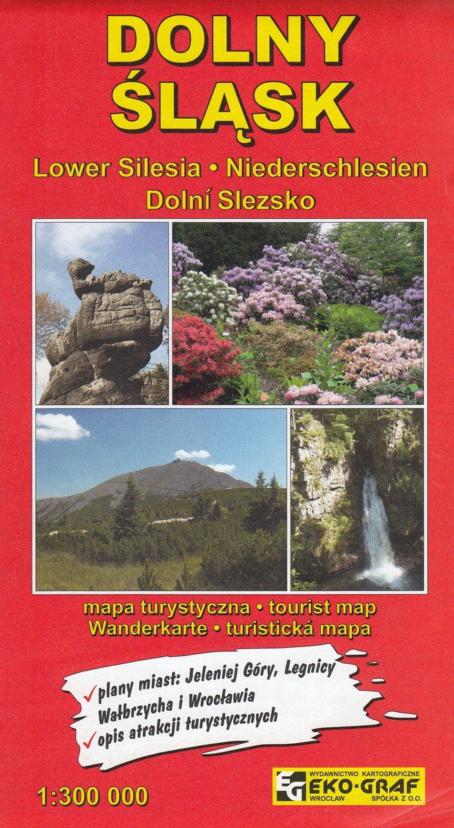 Nowe opracowanie mapy ze szczegółowym obrazem sieci drogowej południowo-zachodniej Polski, bloczkowym obrazem zabudowy miejscowości oraz rozbudowaną klasyfikacją atrakcji turystycznych regionu. Umieszczono też specjalnie przygotowane plany centrów Jeleniej Góry, Legnicy, Wałbrzycha i Wrocławia. Strona 2 zawiera opis atrakcji turystycznych w trzech wersjach językowych (polskiej, angielskiej i niemieckiej) oraz blisko 130 zdjęć obiektów.