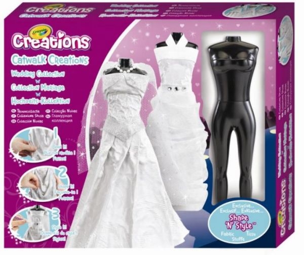 manekin, błyszcząca farbka, 3 "plastyczne" tkaniny w formacie A3, arkusze tkanin ozdobnych, 4 wstążki, arkusz z błyszczącymi ozdobami, taśma dwustronnie klejąca, przewodnik projektanta.