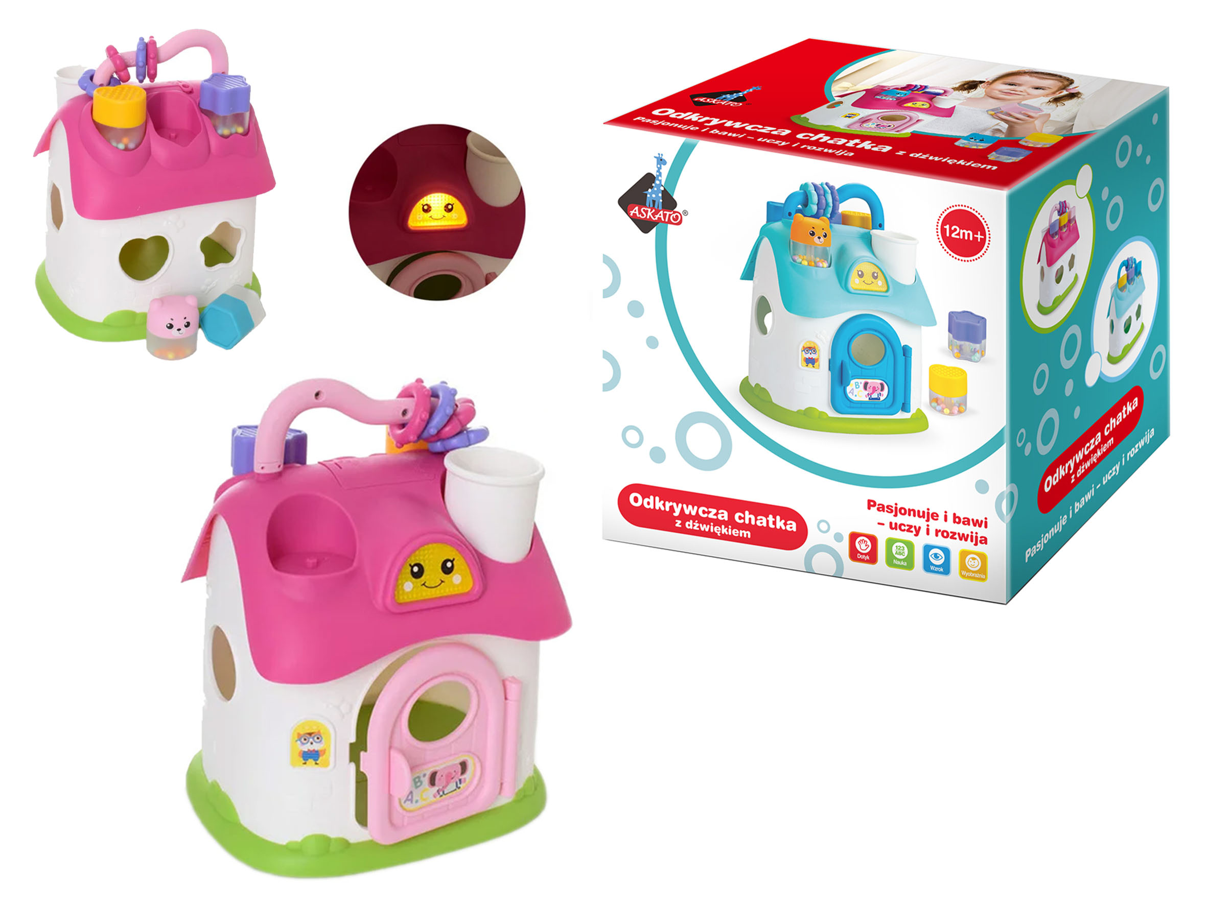 Domek 20x18x16,5 ze światełkiem, w zestawie z klockami, grzechotkami i kluczykiem. Zabawka zasilana 2 bateriami AAA, nie dołaczone do zabawki. x