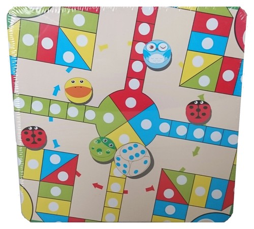 Zawartość: kostka, 20 kolorowych pionków, drewniana plansza-układanka 10 elementów.