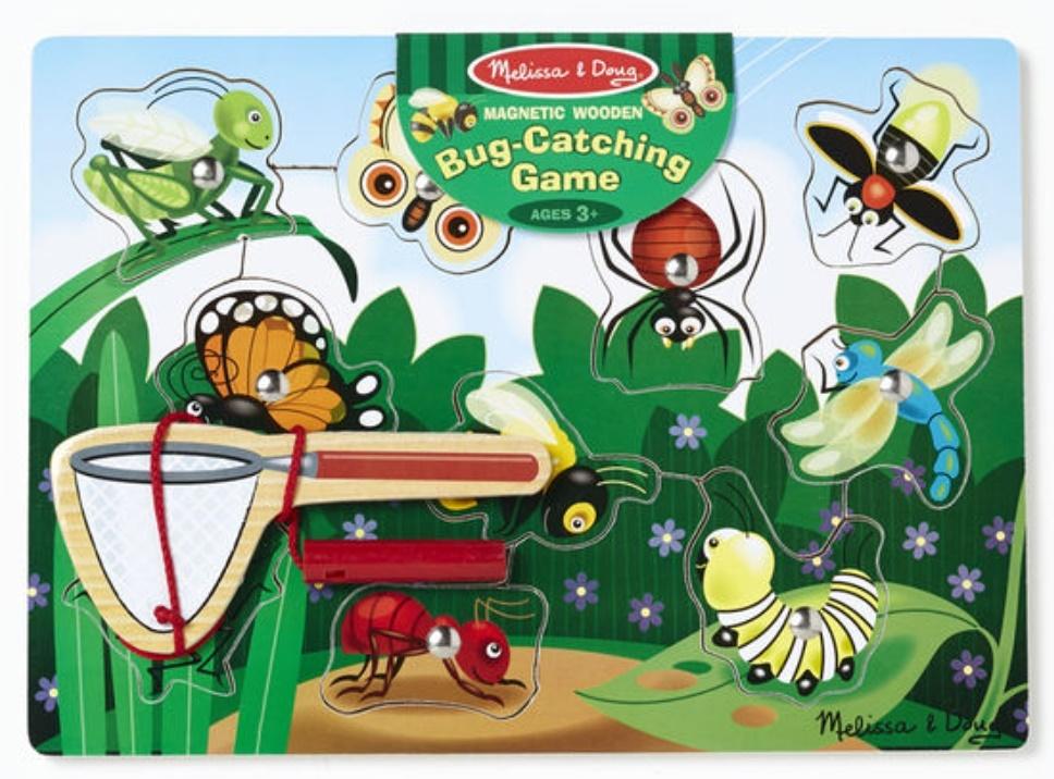 Wciągająca gra – układanka. Dopasuj owady do ich miejsca w ramce, a potem za pomocą specjalnej wędki chwyć je i podnieś do góry. Puzzle mają małe magnesiki, które przyciągane są przez magnesik w wędce, dzięki czemu można je podnosić i przenosić.