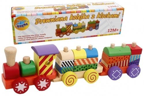 Drewniana kolejka - lokomotywa oraz dwa wagoniki, na których znajdują się klocki o różnych kształtach.