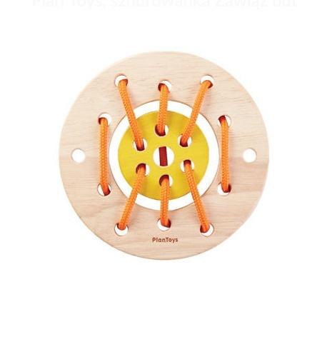 Drewniany zestaw do nauki wiązania na różne sposoby. Pomaga w rozwijaniu umiejętności motorycznych. W zestawie znajdują się dwa drewniane krążki oraz kolorowy sznurek do ich przewlekania.