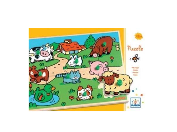 Drewniane puzzle Zwierzęta na wsi to drewniane puzzle kształtowe dla najmłodszych dzieci. Zadaniem dziecka jest dopasowanie danego zwierzątka do właściwego kształtu. Uchwyty na każdym klocku sprawiają, ze małym rączkom niezwykle łatwo je chwycić. W skład puzzli wchodzi 9 zwierząt: koń, krowa, owca, kot, świnka, królik, piesek, kura i kaczka. Ta wspaniała rodzina mieszkająca na wsi pomoże twojemu dziecku poznać nazwy zwierząt oraz rozwinie zręczność paluszków. Fantastyczna zabawka edukacyjna. Wymiary: 29,5x20,5x1 cm Wiek dziecka : 1 rok +Wielkość opakowania : 31,3 x 9,3 x 2,8 cm